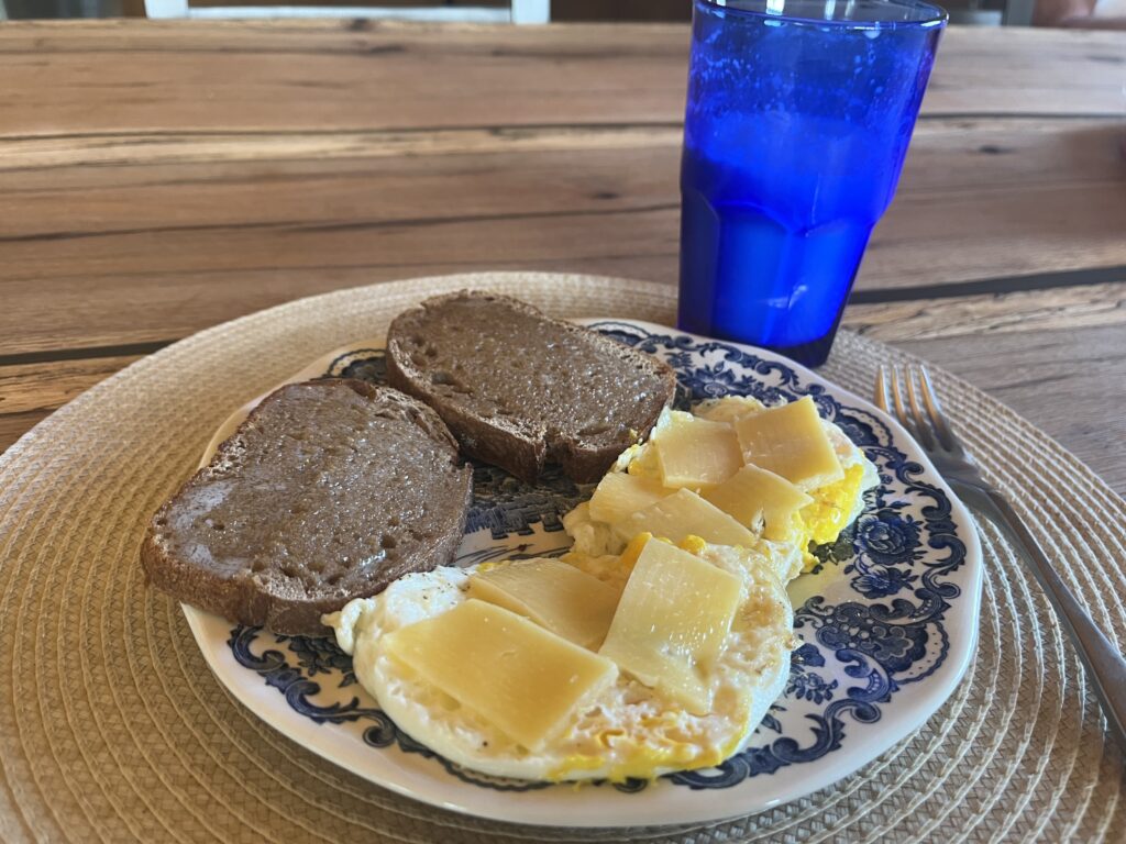 I suppose I could’ve fried my eggs out in the 95° heat easily enough, but they tasted better in the cool kitchen with a big glass of raw milk and a couple slices of sourdough toast.